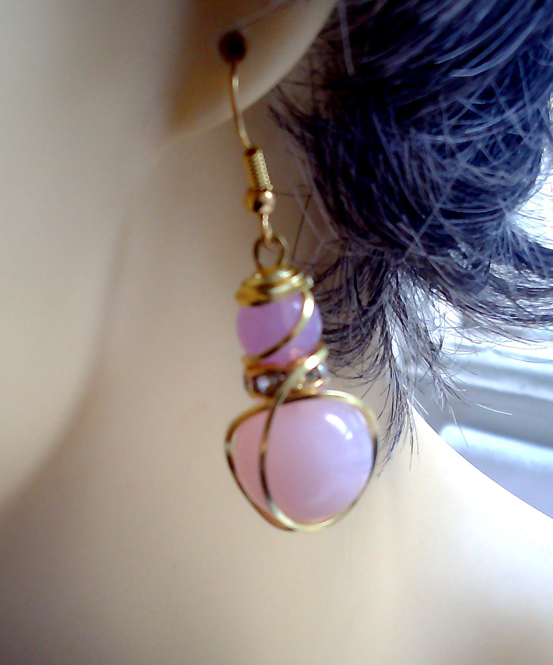 Jolies boucles d'oreilles réalisées avec des perles de verre et du fil de cuivre.