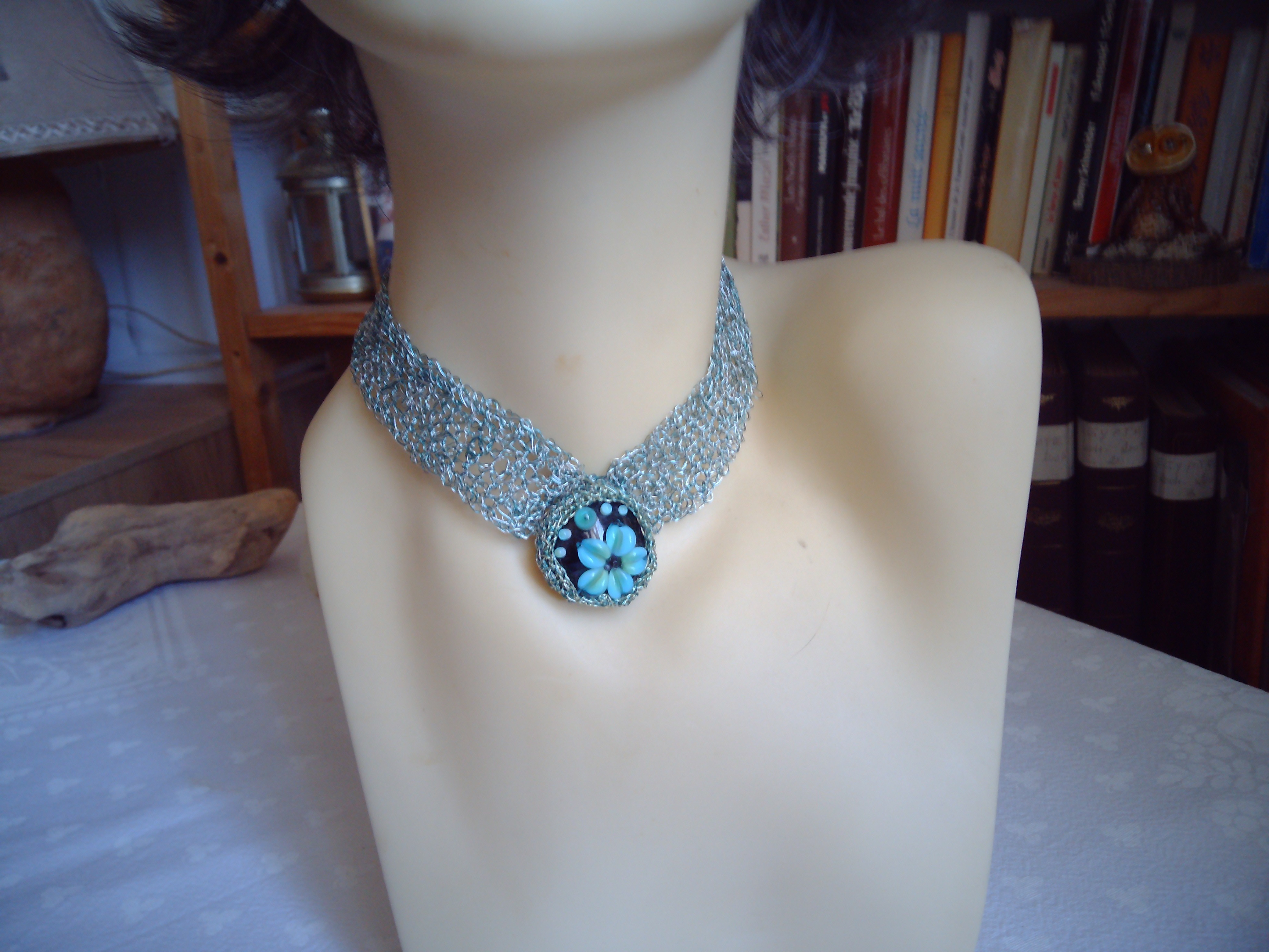 Ce collier est entièrement crocheté à la main avec du fil de cuivre, travaillé maille après maille pour créer une texture souple, légère et délicatement ajourée.